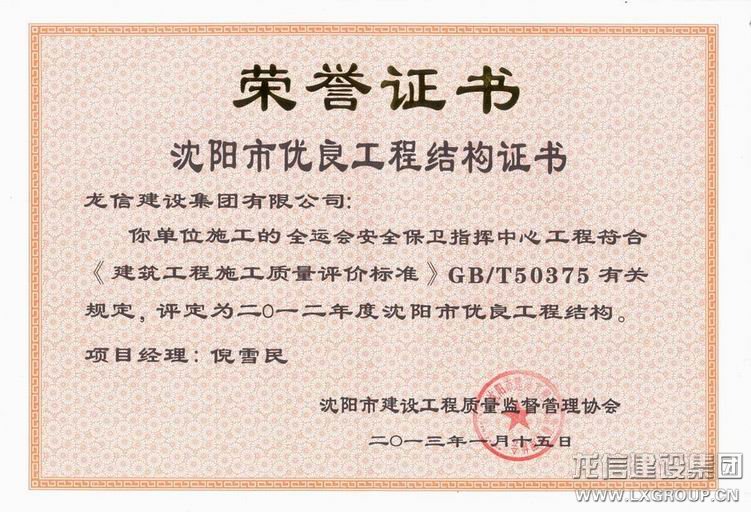 龍信建設集團有限公司承建的第十二屆全國運動會安全保衛指揮中心工程項目獲得“2012年度沈陽市優良工程結構”榮譽稱號。項目部發揚集團公司品牌取勝的經營理念,目前施工總承包的管理和配套裝飾裝修的工作正在緊張進行中并確保如期交付使用;項目部將進一步嚴格工程質量的施工管理,爭創遼寧省優質工程。