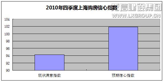 報告顯示,2010年四季度上海購房預期信心指數為101.8點,高出購房現狀信心指數7.5點。業內人士分析認為,上海購房者預期信心高于現狀主要是出于對二次調控的看好。2010年9月29日、10月7日,中央、上海分別公布了新一輪樓市調控政策,出臺了包括限購限貸限外限價等四限政策。該業內人士表示,正是出于對這一輪號稱史上最嚴厲調控效果的看好,促使購房者未來購房信心大增。